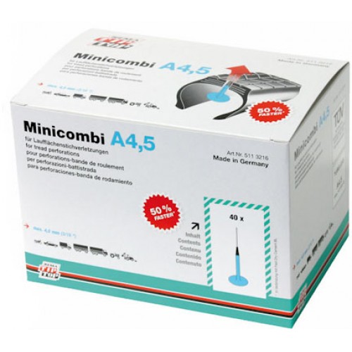МИНИКОМБИ, комбинированный элемент для ремонта проколов в протекторной части радиальных и диагональных шин. Ремонтный элемент МИНИКОМБИ имеет способность самовулканизации на поверхности шины. Предотвращает проникновение воды, грязи, и инородных тел, которое может привести к преждевременному разрушению каркаса и брекерного слоя. Все элементы МИНИКОМБИ поставляются с удобным металлическим штифом для ускорения операции установки элемента в шину. Рекомендуется использовать вместе с клеем для бескамерных шин.